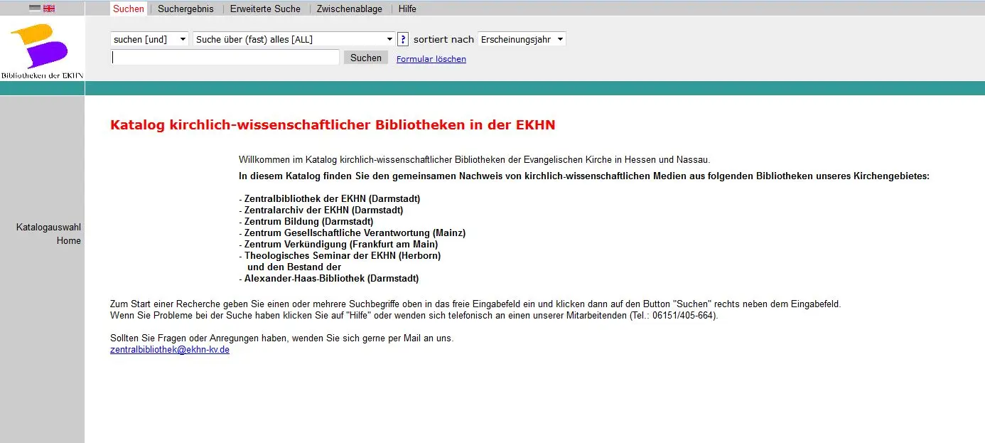 Für Ihre Recherche steht Ihnen unser Online-Katalog zur Verfügung. Hier finden Sie neben unserem eigenen Buchbestand auch das aktuelle Medienangebot anderer Bibliotheken der EKHN.